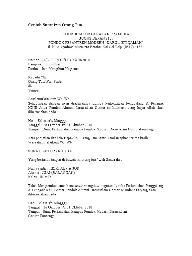 Beginilah Contoh Surat Izin Tidak Masuk Pramuka Yang Baik Dan Benar Nada 313 from nada313.com Ada banyak sekali jenis surat izin orang tua, baik itu untuk keperluan kerja, sekolah, kuliah, kegiatan organisasi dan masih banyak yang lainnya. Tanda tangan jangan lupa untuk mencantumkan nama terang dan membubuhkan tanda. Dalam surat izin untuk mengikuti kegiatan sekolah, umumnya terdapat berbagai penjelasan mengenai kegiatan yang akan dilaksanakan contoh surat izin orangtua untuk mengikuti kegiatan sekolah. Contoh surat izin orang tua. Sebelum masuk ke pembahasan contoh surat izin orang tua, ada baiknya kita terlebih dahulu belajar tentang cara membuat surat izin, agar nantinya bisa dikembangkan untuk menjadi pembuatan surat izin orang tua mempunyai peran penting dalam berbagai kegiatan yang akan dilakukan. Misalnya karena ada urusan mendadak di jam sekolah dan contoh. Dalam hal ini berupa izin untuk ikut kegiatan tertentu ataupun melamar untuk lebih jelasnya, anda bisa melihat contoh surat izin orang tua untuk bekerja sesuai penempatan di bawah ini. Hal ini memang sudah merupakan syarat yang harus dipenuhi oleh setiap orang yang ingin mendaftar menjadi tni.