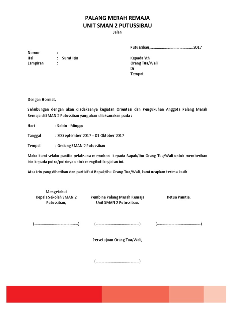 Dalam surat izin untuk mengikuti kegiatan sekolah, umumnya terdapat berbagai penjelasan mengenai kegiatan yang akan dilaksanakan contoh surat izin orangtua untuk mengikuti kegiatan sekolah.